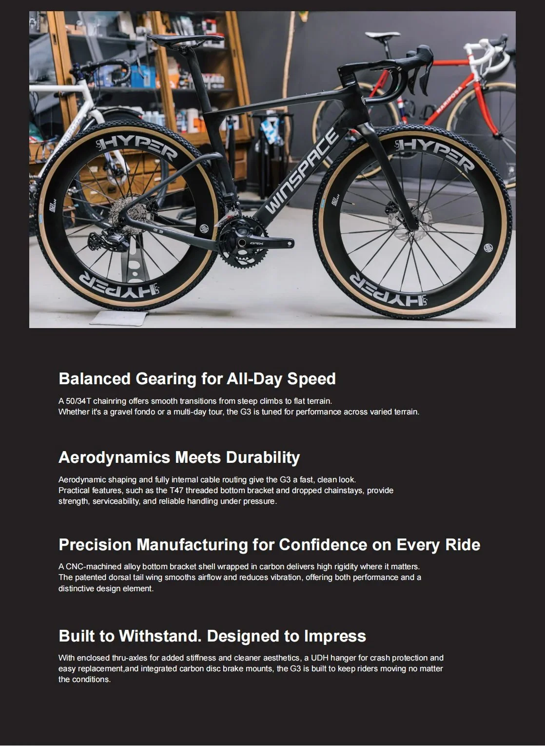 Building on the success of the G2, the G3 Gravel Frameset pushes boundaries with a lighter, stiffer frame and aerodynamic enhancements, making it ideal for competitive racing or epic adventures. Its progressive geometry ensures confidence on descents, while the large front triangle and multiple mounts accommodate bikepacking gear. Designed by Winspace’s expert team in Xiamen, China, with input from pro cyclists, the G3 delivers top-tier performance at an accessible price.